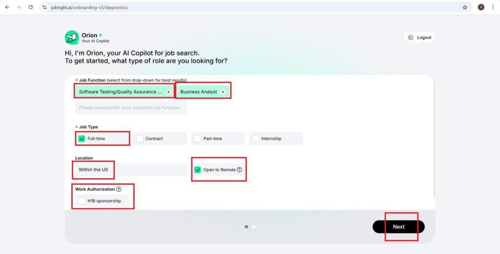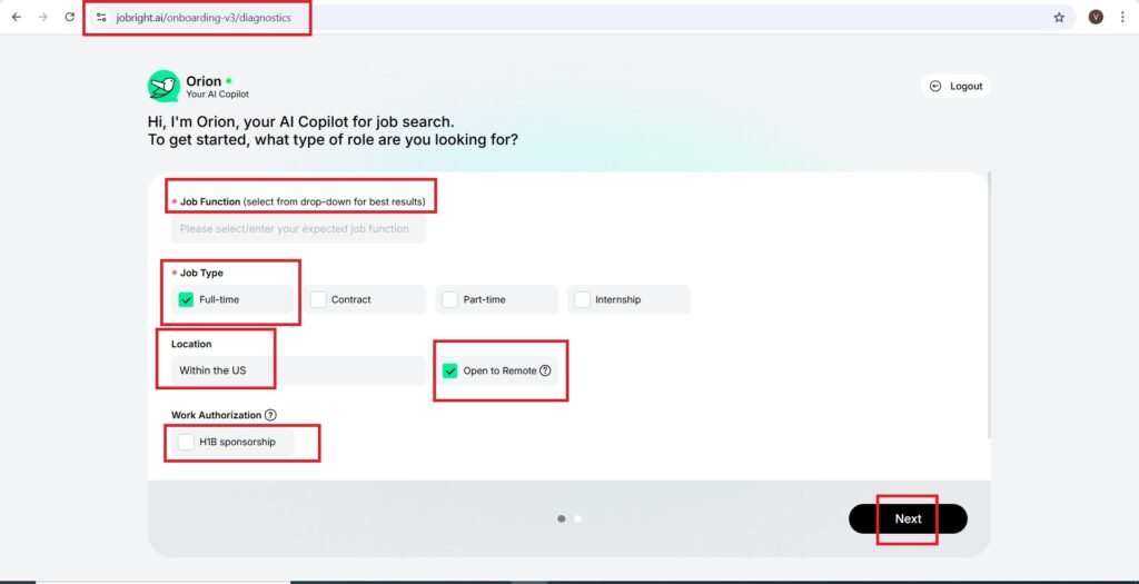 - You can select your Job Function, Job Type, Location, Open to Remote, Work Authorization—>