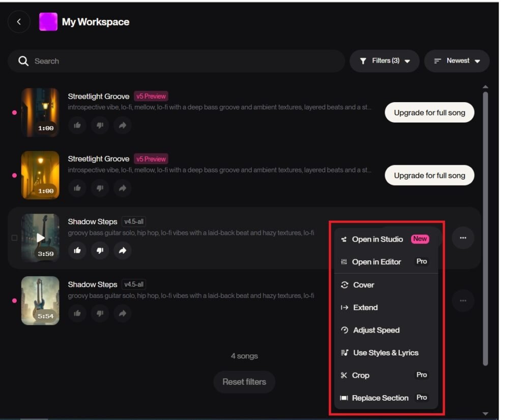 - If you press the thee dots on the right of the song, you will get the following options—>